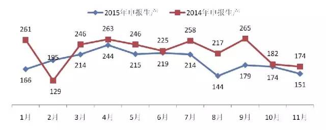 从申报临床和申报生产的受理情况来看,系列新政出台后,2015年申报临床和申报生产的受理量与2014年相比均出现不同程度下滑。受药物临床试验数据自查核查的影响,申报临床的受理号从7月份的394个大幅下滑到8月份的214个,下滑幅度达45%。8-11月,申报临床的受理号一直维持在170~240个之间。而申报生产的受理号数量虽在8月份出现下滑,