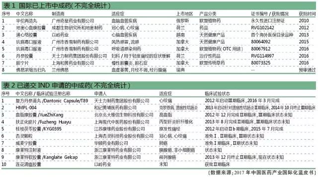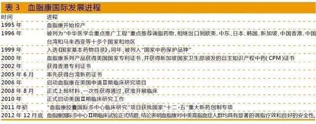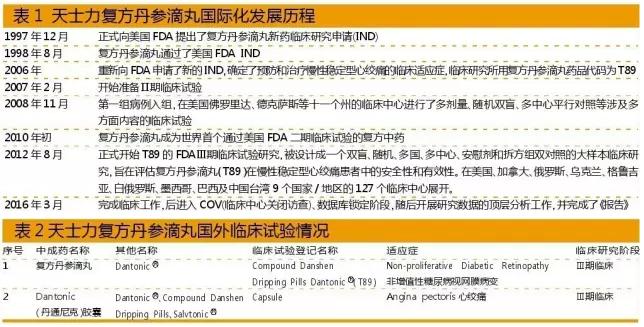 1996年开始启动复方丹参滴丸的FDA临床申报,历经从摸索、坚持到创新的艰难历程,目前已取得中药国际化的重大突破,其国际化发展历程见表1、表2。